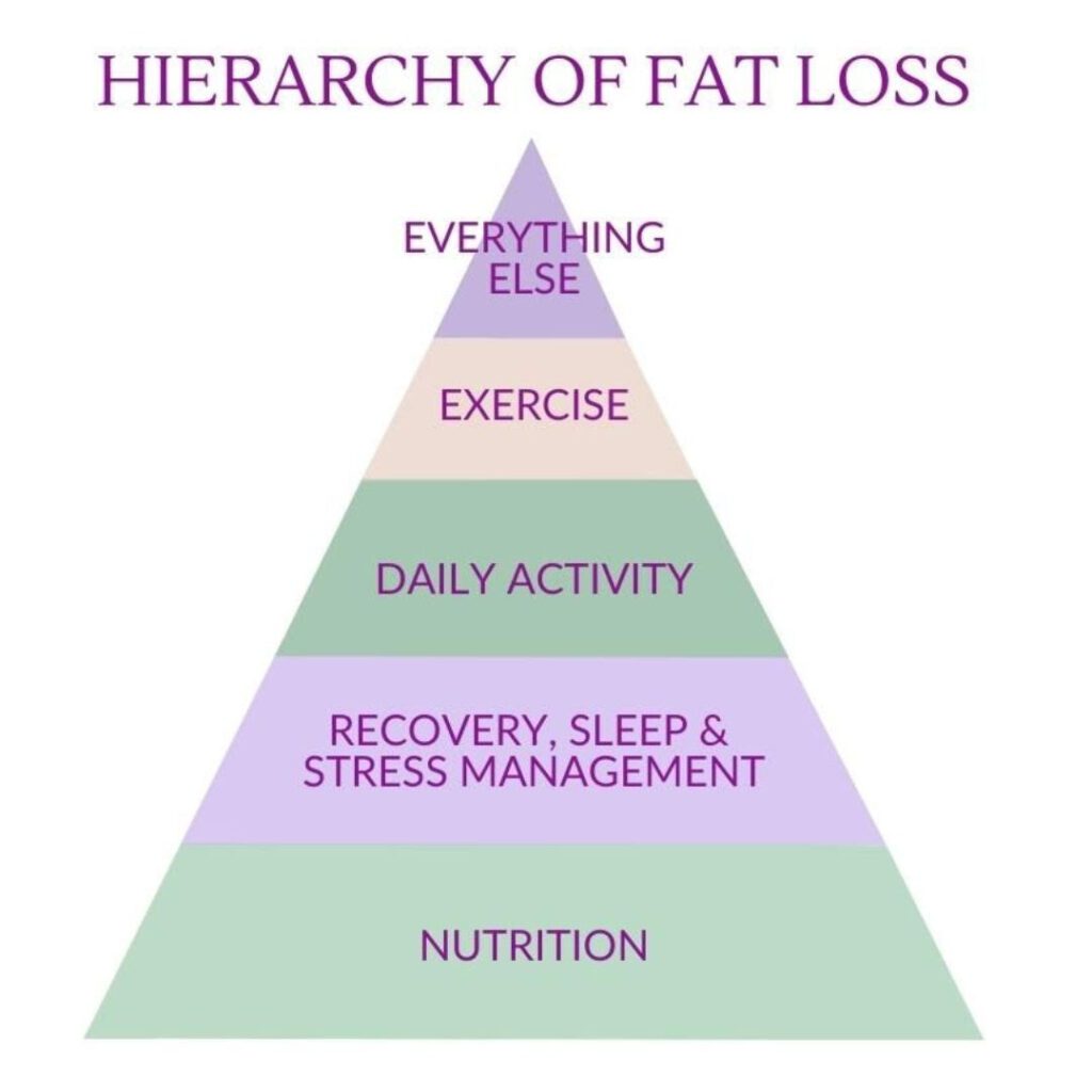 Today I want to talk to you about what really matters when it comes to weight loss; where you should be directing your energy, and to cut through all the misinformation out there about the best way to lose fat. Now I know that everyone would like to see quick results and that's why some fad diets are so tempting, HOWEVER, the quicker you lose weight, the harder it is maintain long term (stay tuned for that edition where I dive into the rebound effect). Here's the hard truth. If you want to lose fat, you need to be okay with committing for the long haul, embracing delayed gratification and focusing on all the other amazing benefits of improving your health and fitness. So listen up ladies, because here is the hierarchy of fat loss importance. Here are the things you should be focusing on to lose fat mass AND keep it off. It's not a magic pill, it's not complicated and it's not flashy. It's simple, achievable and all it requires is commitment to consistency. It's all about building the habits that have the greatest impact on achieving your weight loss goals and making lasting progress—this applies to all women but I'm doing a shout out to women in the transformative phase of peri-menopause and menopause.